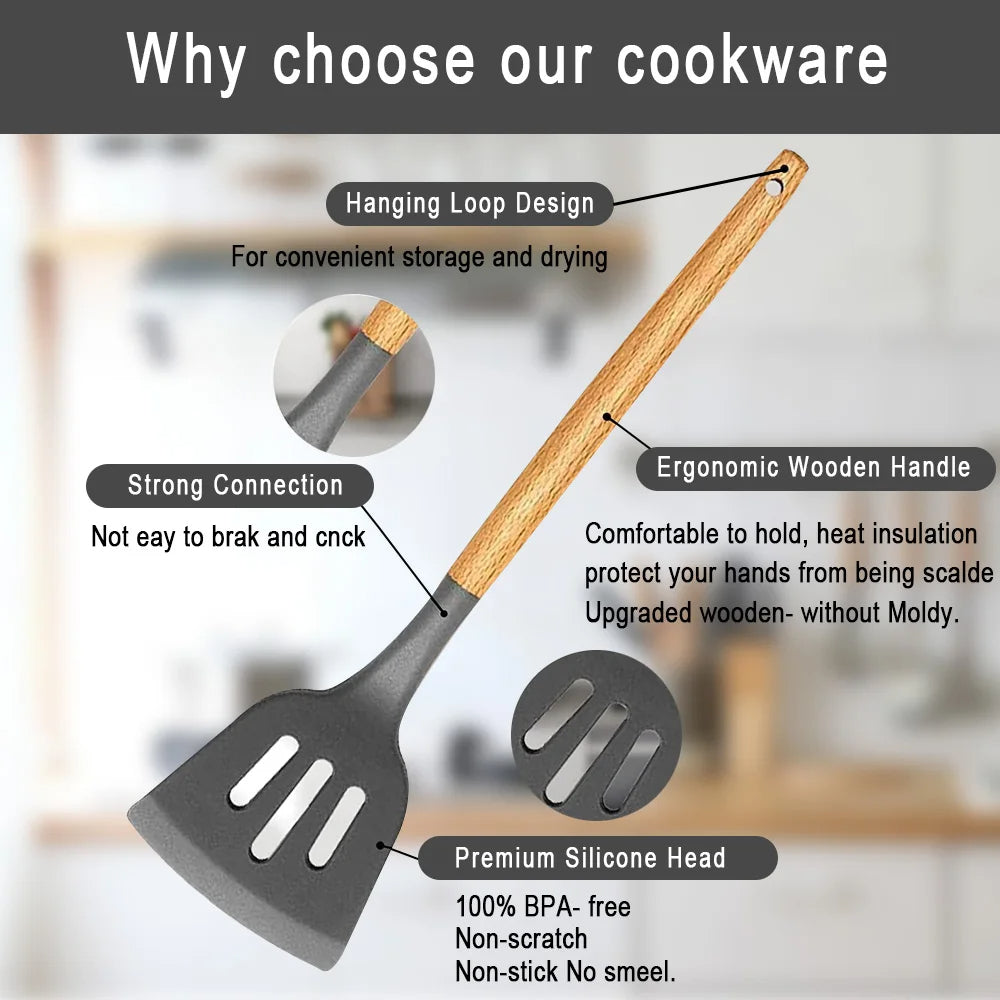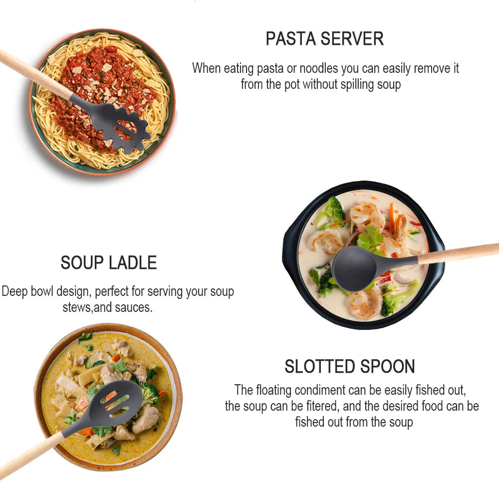 Transform your cooking experience with this 11-piece silicone utensil set, crafted for convenience, durability, and style. Made from heat-resistant, non-stick silicone, each tool is gentle on cookware and ideal for all types of food prep. The elegant wooden handles offer a secure grip and a touch of natural charm, with a detachable design for effortless cleaning and storage. A perfect companion for home chefs and cooking lovers.