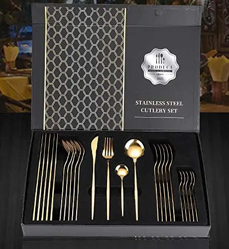 Enhance every meal with this stunning 24-piece flatware set, made from high-quality stainless steel and finished with a mirror gold coating for a refined touch. Designed for long-lasting use and timeless elegance, it’s perfect for formal dining, celebrations, or adding a hint of luxury to your everyday table.