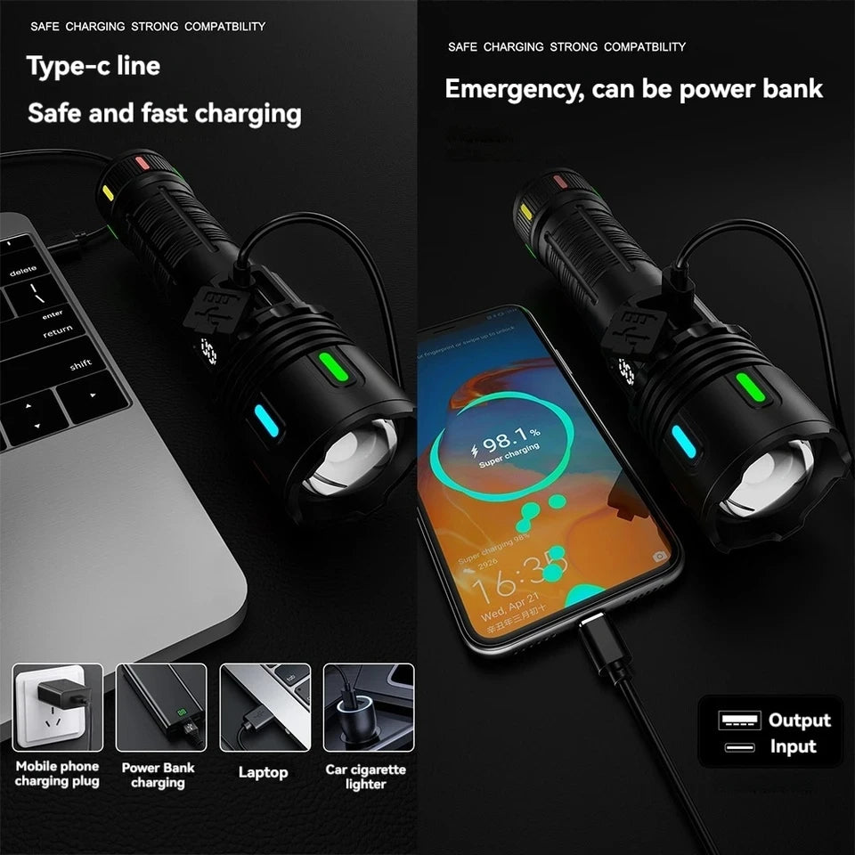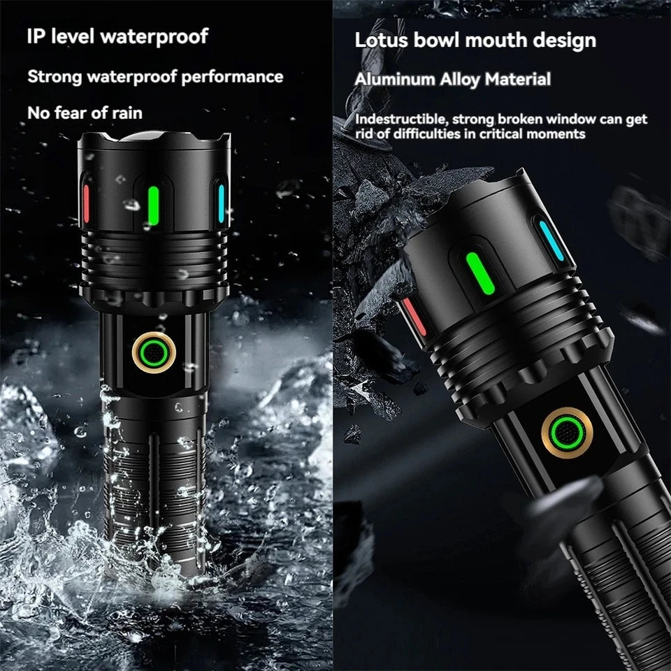 Experience unmatched brightness and range with the Aluminium Alloy LED Flashlight, engineered for performance and reliability. Delivering an incredible 5000-meter beam distance, this high-power flashlight uses advanced LED technology to provide clear, focused light while maintaining energy efficiency. The telescopic zoom function lets you easily switch between wide floodlight and targeted spotlight modes, making it perfect for a wide range of situations. Constructed from robust aluminium alloy, it's resistant to impact and weather, ideal for tactical use, outdoor adventures, or emergency situations. Lightweight and portable, it's your go-to tool for hiking, camping, search and rescue, or everyday utility lighting.